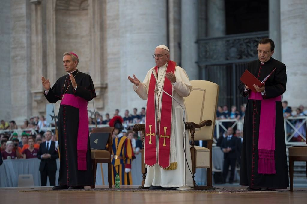 „Keresd a békét, és a járj nyomában!” – ez a mottója a nemzetközi ministránszarándoklatnak – emlékeztetett a Szentatya. – A béke mindig Jézus Krisztus által születik. Mi tehát a békére kaptunk meghívást. Van egy ima, amelyet Szent Ferenc lelkisége hat át: ha Istenre bízzuk magunkat, ha átadjuk magunkat Isten kezébe, akkor a béke eszközeivé válunk. Imádkozzunk tehát Szent Ferenc nyomán: „Ó, Uram, te mindannyiunkat ismersz, ismered erősségeinket és gyengeségeinket, a rosszból a jóra hívsz minket. Arra bátorítasz, hogy szeressünk, hogy értsük meg felebarátainkat és bocsássunk meg. Tekintetünket az énről irányítsd a te felé. Küldj el bennünket, hogy megvédjük a békét, és azt elsőként éljük meg. Vezess bennünket, hogy eszközeiddé váljunk. Erre kérünk most és mindörökkön örökké. Ámen.”