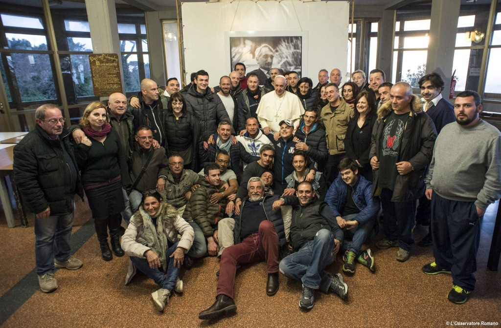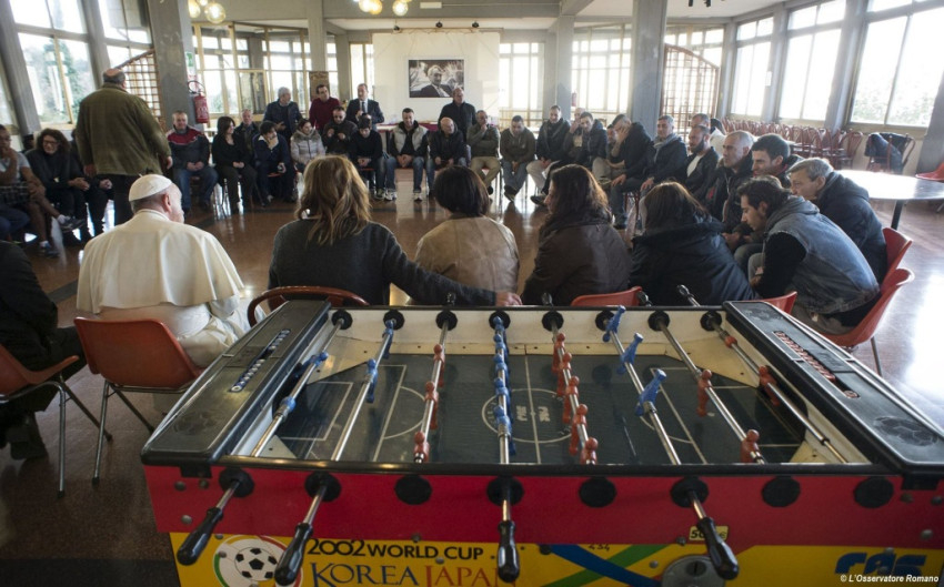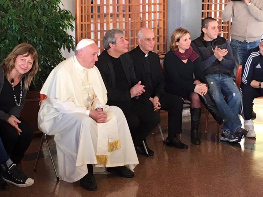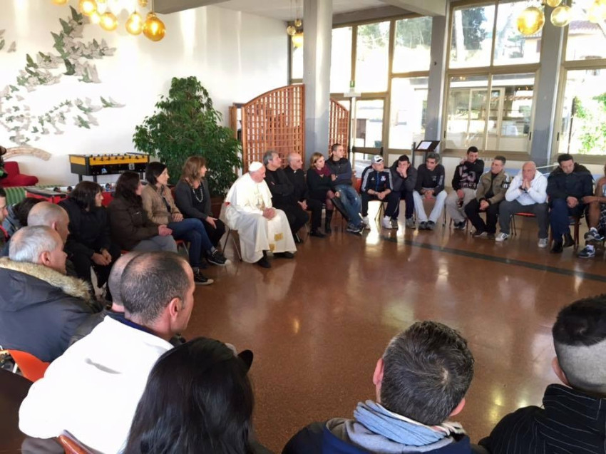 Ez a pénteki látogatás is meglepetés volt. A pápa hivatalos kíséret nélkül érkezett a San Carlo-segítőközpontba. Egyedül Rino Fisichella érsek, az Új Evangelizáció Pápai Tanácsának elnöke kísérte el. A gondozott fiatalok éppen délutáni megszokott közösségi tevékenységüket végezték kisebb csoportokban, amikor egyszer csak megjelent közöttük Ferenc pápa.