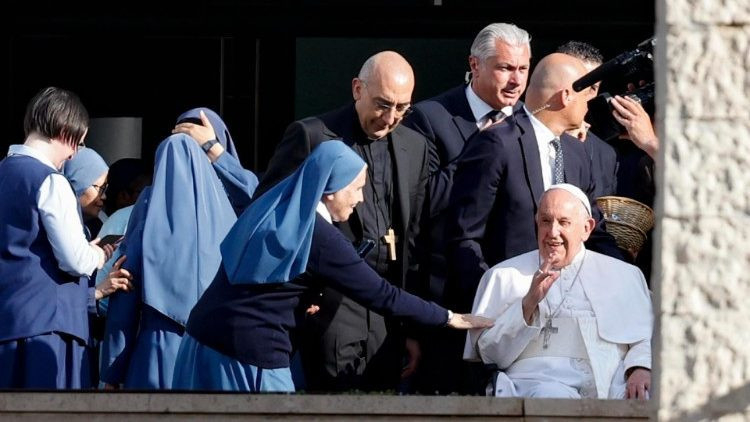 „Isten hozott nálunk, Ferenc pápa!” – köszöntötték a Szentatyát, püspöküket kitörő örömmel, őszinte szeretettel a nővérek, aki azért jött, hogy az idős atyák után most a tíz éven belül szentelt fiatal papokkal beszélgessen.