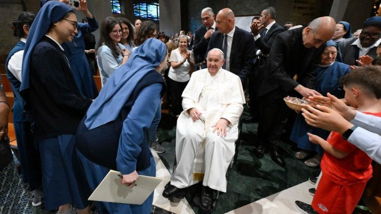 Ferenc pápa előbb a házigazda szerzetesnővéreket köszöntötte, kezet fogott velük, majd egy kisgyerektől egy fehér léggömböt kapott, amit ő áldással és egy cukorkával köszönt meg. Ezután édességgel kedveskedett a nővéreknek is. Az Isteni Mester Kegyes Leányai közössége februárban ünnepelte alapítása centenáriumát, ez alkalomból egy miseruhát és az alapítónő életéről szóló könyvet ajándékoztak a pápának.