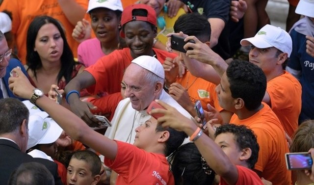 Kezdjük a fiatalokkal, ők jelentették ugyanis az út első okát. Ismételten válaszoltak a felhívásra: eljöttek az egész világról – némelyikük itt is van! [rámutat a teremben lévő zarándokokra] –, ez a színek, a különböző arcok, nyelvek és élettörténetek ünnepe volt. Nem tudom, hogy csinálják: eltérő nyelven beszélnek, mégis meg tudják érteni egymást! Miért? Mert megvan bennük az akarat, hogy együtt haladjanak előre, hogy hidakat építsenek, a testvériség hídjait. Magukkal hozták sebeiket, kérdéseiket is, de legfőképpen a találkozás lehetőségének örömét. Ismételten megalkották a testvériség mozaikját! A testvériség mozaikjáról beszélhetünk. Az ifjúsági világnapok emblematikus képe a fiatalok által lengetett zászlók színes kavalkádja: az ifjúsági világnapon ugyanis a nemzeti zászlók szebbé válnak, mondhatni „megtisztulnak”, és egymással szembenálló nemzetek zászlói is egymás mellett lobognak. Milyen szép ez! Itt is vannak zászlók… mutassátok csak!