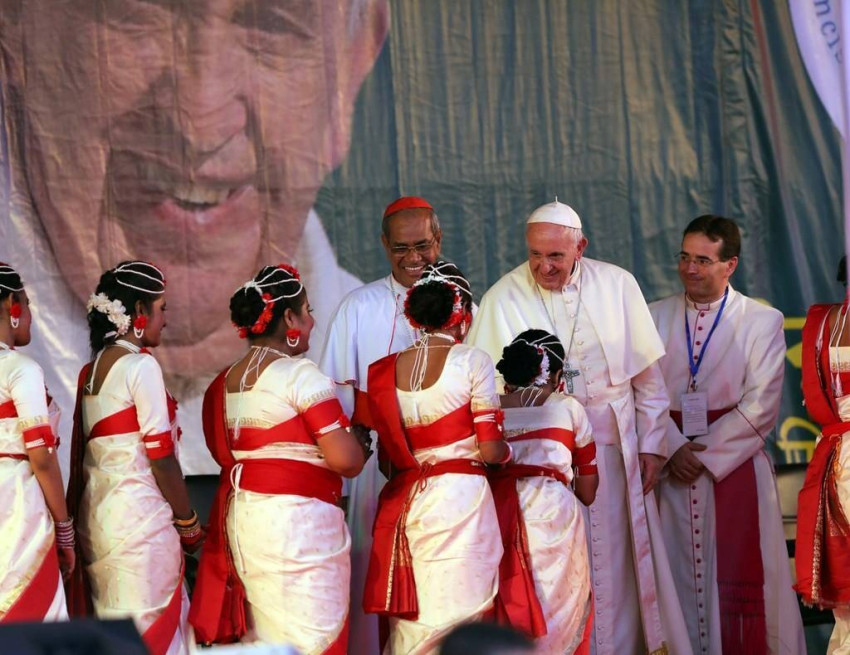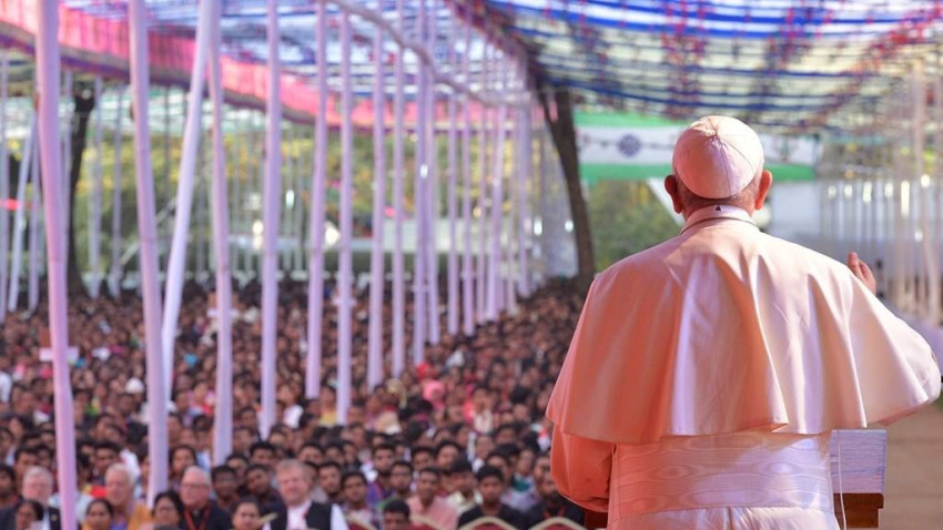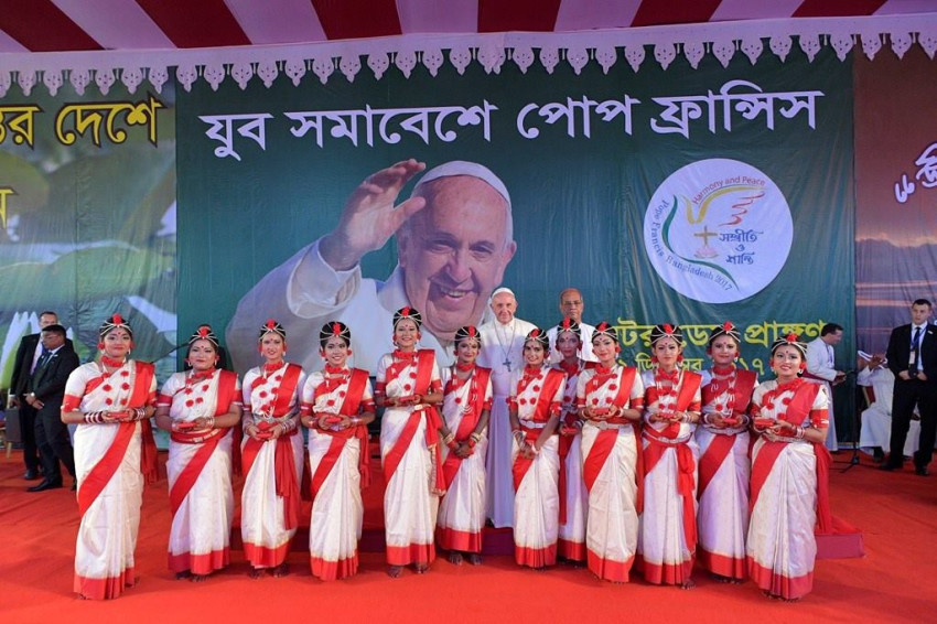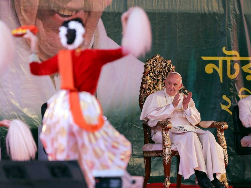 Mindnyájatoknak hálás vagyok a meleg fogadtatásért! Köszönöm Gervas [Rozario] püspök kedves szavait, valamint Upasana és Anthony tanúságtételét. Van valami egyedülálló a fiatalokban: ti állandóan tele vagytok lelkesedéssel, állandóan! Annyira szép ez! Valahányszor találkozom veletek, mindig megfiatalodom! Upasana, te említetted ezt a tanúságtételedben, azt mondtad, hogy tényleg „nagyon lelkes” vagy, és én ezt látom, érzékelem is. Ez a fiatalos lelkesedés a kalandvágyhoz kapcsolódik. Egyik nemzeti költőtök, Kazi Nazrul Islam megfogalmazta ezt, az ország ifjúságát „rettenthetetlennek” nevezte, mely „képes világra hozni a fényt a sötétség méhéből”. Milyen szép ez! A fiatalok mindig készek arra, hogy eltökélten belevágjanak a dolgokba, képesek engedni, hogy a dolog megtörténjenek, tudnak kockáztatni. Bátorítalak titeket, hogy ezzel a lelkesedéssel haladjatok előre, kedvező és kedvezőtlen körülmények között egyaránt. Haladjatok csak előre, főleg amikor úgy érzitek, hogy tele vagytok nehézséggel és szomorúsággal, és életetek horizontján semerre sem látjátok Isten napját.