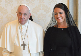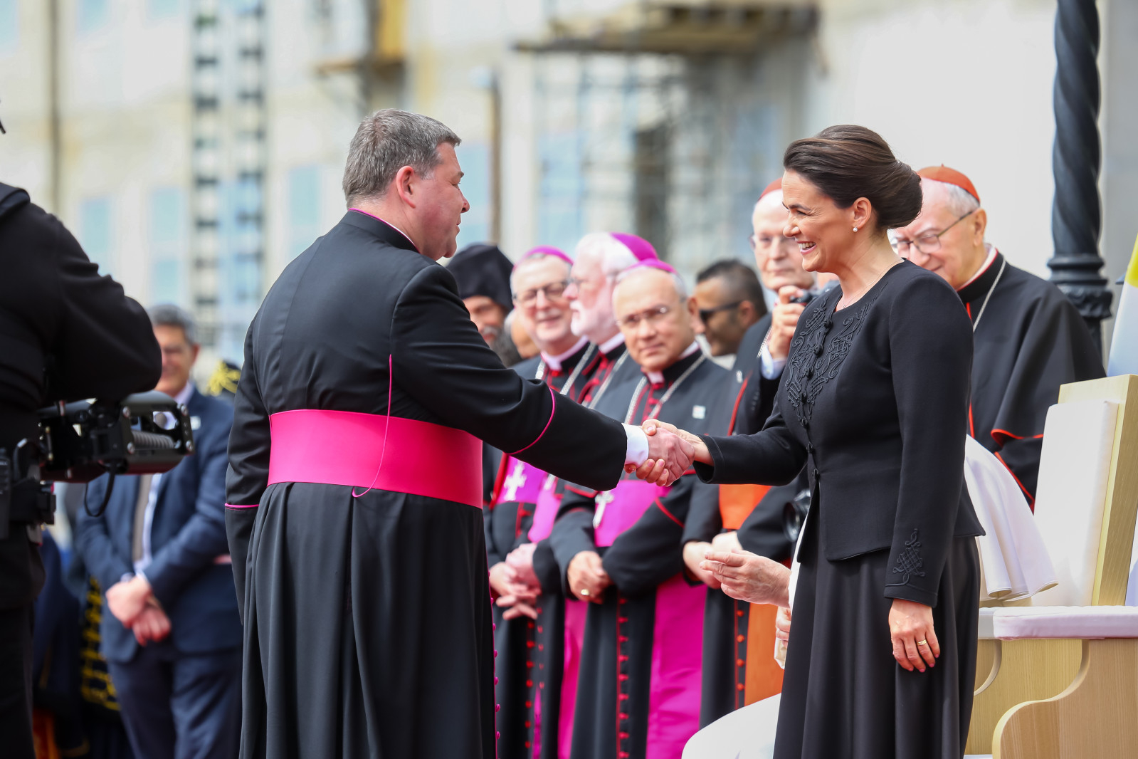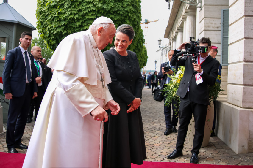 Miután a díszmenet elvonult előttük, Novák Katalin bemutatta a Szentatyának az állami delegációt.