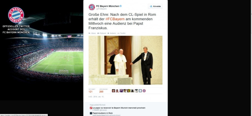 Miután a Bayern München a Bajnokok Ligája keretében megmérkőzik az AS Roma csapatával, különleges megtiszteltetésben lesz részük a klub játékosainak és edzőjüknek, Pep Guardiolának. Ferenc pápa magánkihallgatáson fogadja őket. Az október 22-ei látogatás helyszíne a VI. Pál-terem előtti kisterem lesz, időben pedig megelőzi a szerdai általános kihallgatást – tájékoztatott a részletekről a Vatikán.