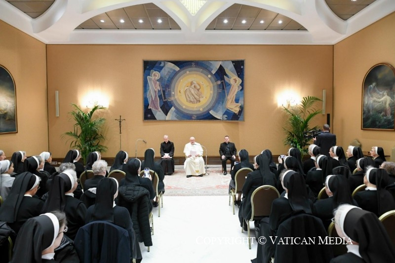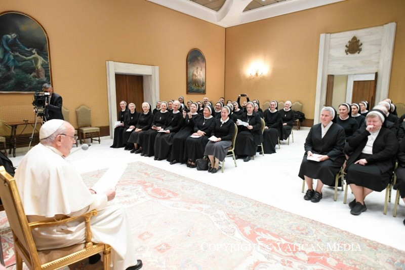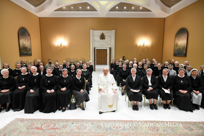 A pápa utalt arra a sok családra, melyeket háború sújt, vagy kénytelenek elhagyni otthonukat, sőt hazájukat. Arra buzdította a nővéreket, hogy mindig végezzék az irgalmasság lelki és testi cselekedeteit. „Imáitok és gyakorlati jótékonysági tevékenységeitek mindig tükrözzék Jézus szeretetét, hogy a remény jelei legyetek azoknak, akik bármilyen nehézséggel küzdenek” – zárta beszédét Ferenc pápa.