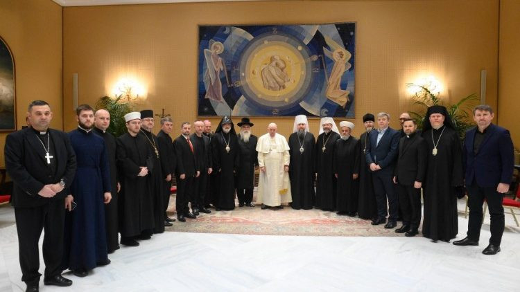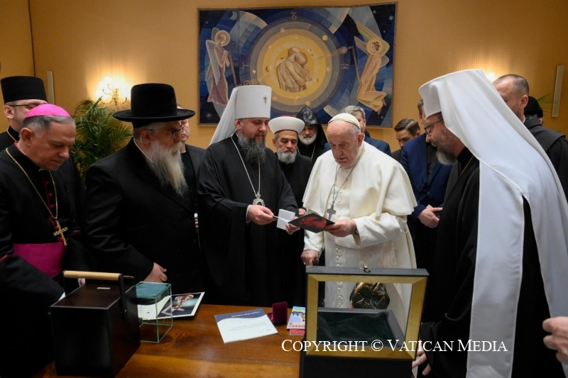 A Szentatya közelségéről és imáiról biztosította a küldötteket. Elmondta, rendszeresen fogadja Ukrajna elnökének követeit, és folyamatosan párbeszédet folytat az ukrán nép képviselőivel. „Köszönöm nektek egységeteket, ez sokat jelent a számomra. Olyan ez, mint a gyerekek a családban – az egyik ott van, a másik valahol máshol, de amikor az anya beteg, akkor mindenki összejön” – mondta. Rámutatott: „Nem annyira a zsidó Ukrajnáról, a keresztény Ukrajnáról, az ortodox Ukrajnáról, a katolikus Ukrajnáról, az iszlám Ukrajnáról van szó, nem, hanem Ukrajnáról, az anya Ukrajnáról, arról, hogy mindannyian együtt vagyunk!”