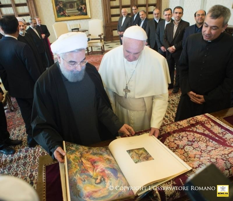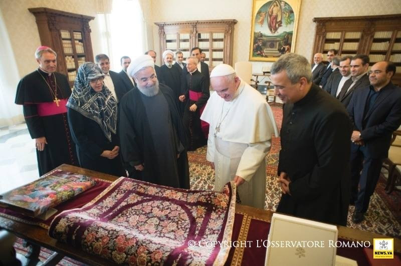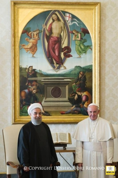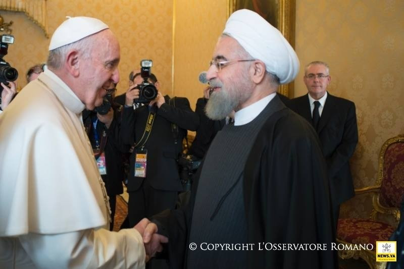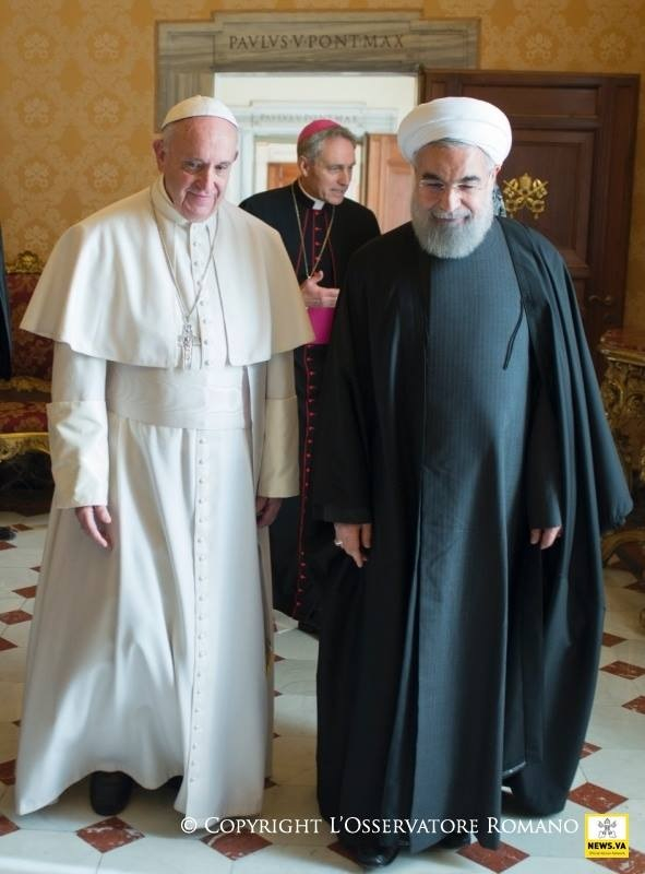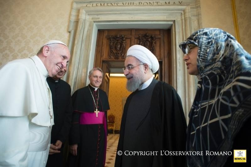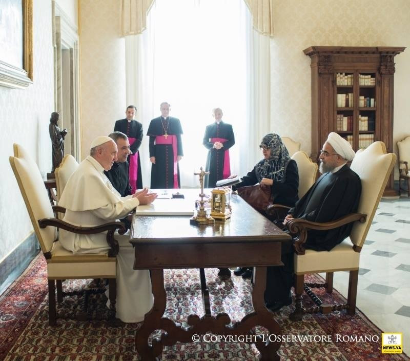 „Nagyon köszönöm a látogatását, és reménykedem a békében” – ezekkel a szavakkal búcsúzott Ferenc pápa az iráni elnöktől a vatikáni audiencia végén. „Igazán nagyon örültem a találkozásnak, jó munkát kívánok” – hangzott Rohani elnök válasza. Hosszú, negyvenperces magánmegbeszélést folytattak zárt ajtók mögött, amelynek végén Rohani elnök kérte a pápát, hogy imádkozzon érte.