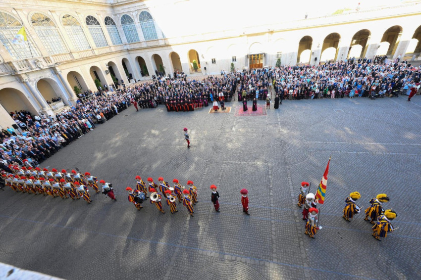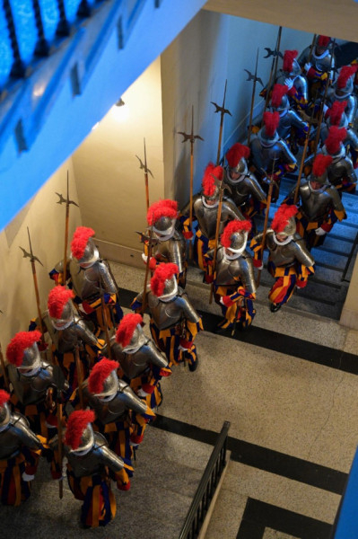 A Szentatya örömmel üdvözölte a gárdistákat az Apostoli Palotában, amelyet jól ismernek, hiszen ott végzik értékes munkájukat. Név szerint köszöntötte a gárdaparancsnok Christoph Graf ezredest és Kolumban Reichlin káplánt, a tiszteket, altiszteket, a gárdistákat, családtagjaikkal együtt. Külön üdvözölte a pápa az új gárdistákat és rokonaikat, akik az eskütétel ünnepére érkeztek, örömmel köszönte meg az újoncok elkötelezettségét, amivel a Péter-utód iránti hűségükről tanúskodnak.