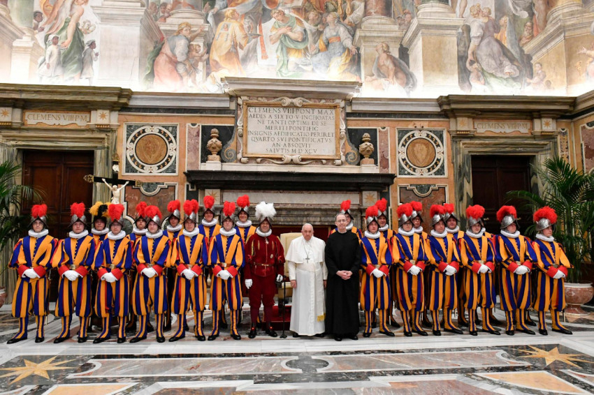 A Svájci Gárda egy nagy család, élénk testvéri közösség, a szolgálat során éppúgy, mint szabadidőben. A család pedig a növekedés helye, éppúgy a gárda is, amely az emberi és keresztény formálódás környezete a tagok számára. A fiatalokat az idősek tapasztalatai gazdagítják, akik viszont tanulhatnak a fiatalok nyitottságából és lelkesedéséből, ami folytonos felfedezésre készteti őket. Ferenc pápa az újoncok lelkére kötötte, hogy ne veszítsék el bátorságukat és szenvedélyüket, hogy új dolgokat fedezzenek fel. A Szentatya szívesen gondol arra, hogy