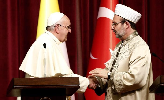 Az erőszakot csak összefogással lehet legyőzni, a kormányok, a politikai és vallási vezetők, a civil társadalom és minden jóakaratú ember részvételével. A keresztények és a muzulmánok felbecsülhetetlen lelki értékek letéteményesei, melyek között hasonló vonásokat is találunk: az irgalmas Isten imádása, utalás Ábrahám prófétára, az imádság, az alamizsna, a böjt. Ha ezeket őszintén megéljük, akkor átalakíthatjuk az életünket és szilárd alapot teremthetünk az emberi méltóság és testvériség számára. Mindkét vallás elismeri az emberi személy szent mivoltát, és ez együttérzésre, szolidaritásra és tényleges segítségre ösztönöz a rászorulók iránt. A pápa elismerését fejezte ki az egész török népnek, muzulmánoknak és keresztényeknek, a konfliktusok elől menekülő emberek százezreinek befogadásáért.