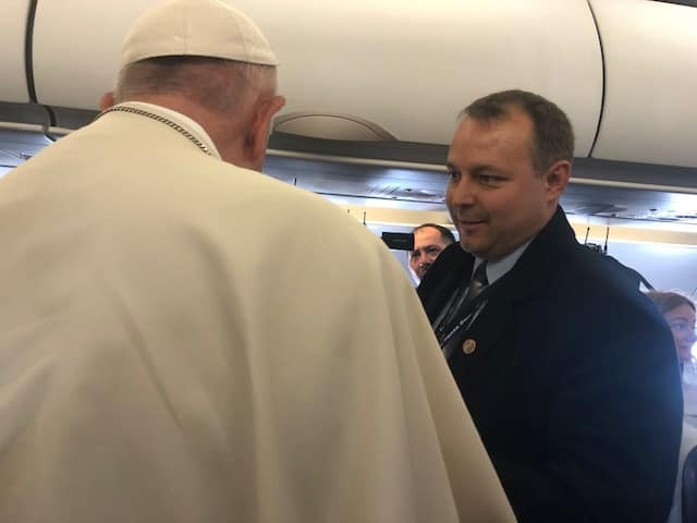 Mielőtt személyesen beszélt volna az újságírókkal, a vele utazóknak azt mondta Ferenc pápa, hogy a látogatás ideje alatt végig rossz időt jósolnak a szakemberek, de reméli, hogy ezúttal is ugyanaz fog történni, mint a bulgáriai látogatása során, amikor ugyancsak rossz időt jósoltak, mégis elfogadhatóvá váltak a körülmények, és sikeres volt az apostoli út. Ezután végigjárta a gépet, és az egyes újságírókkal szóba elegyedett, mindenkivel kezet fogott; volt, aki ajándékkal készült a találkozásra.