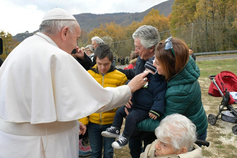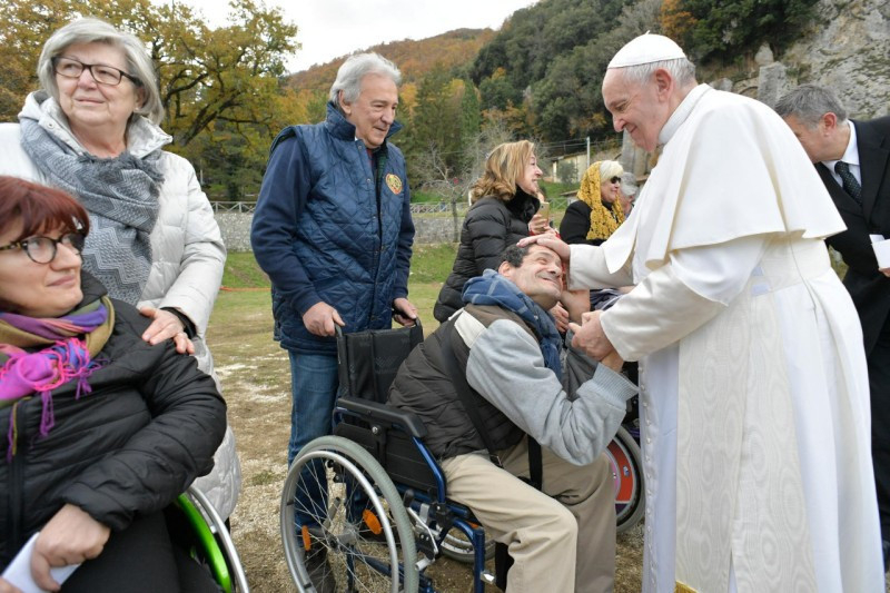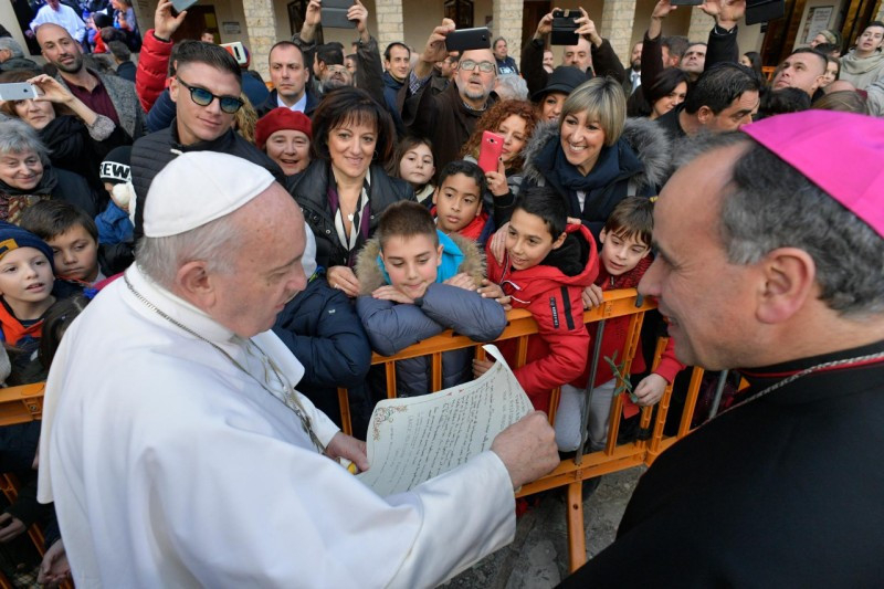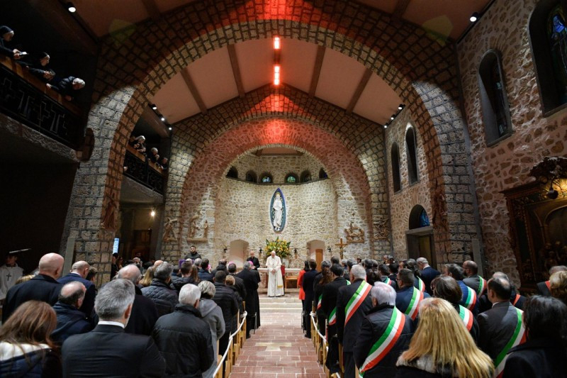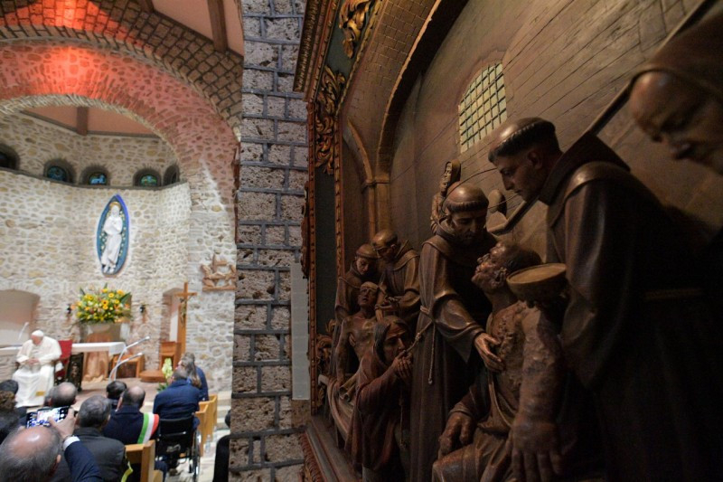 A Szentatya a kegyhely előtti téren üdvözölte az ott várakozó betegeket és fogyatékkal élőket. Ezt követően Domenico Pompili, a rieti egyházmegye püspöke, Francesco Rossi, a ferences kegyhely igazgatója és Rino Fisichella érsek, az Új Evangelizáció Pápai Tanácsának elnöke fogadta a pápát, aki Greccióban aláírta a betlehem jelentőségéről és értékéről szóló Admirabile signum apostoli levelet, majd igeliturgiát tartott.