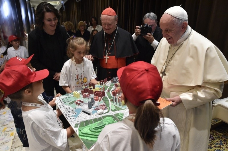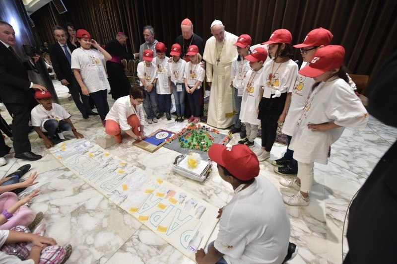Immár hatodik alkalommal gördült be a „Gyermekvonat” szerelvénye a Szent Péter vasútállomásra. Amikor a vonat megállt, sípszó és kiáltás harsant: „Itt a Vatikán! Kiszállás!” Pillanatok alatt olyanná lett a Vatikán, mint egy óriási iskola szünidei zsibongója. A „Népek udvara” kezdeményezés keretében idén hatodik alkalommal rendezték meg a „Gyermekvonat”-ot, melynek során iskolás fiúk és lányok tisztelegtek a Szentatyánál. Az idei mottó: „Kis utasok, nagy építészek, baráti város”. A rendkívüli program legnagyobb eseménye a Ferenc pápával való találkozás volt a VI. Pál aulában.