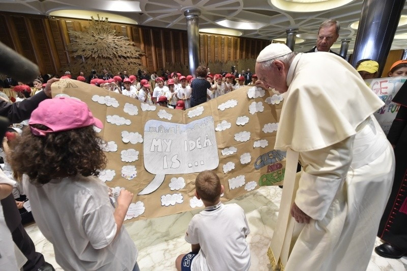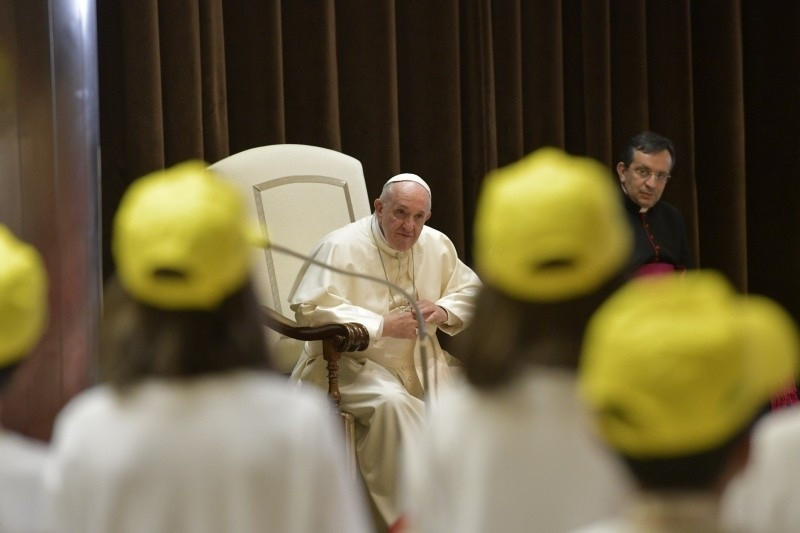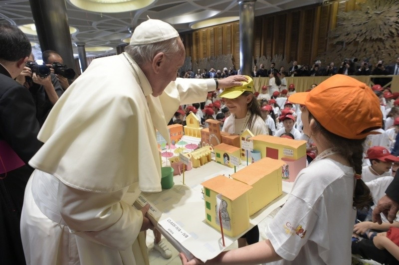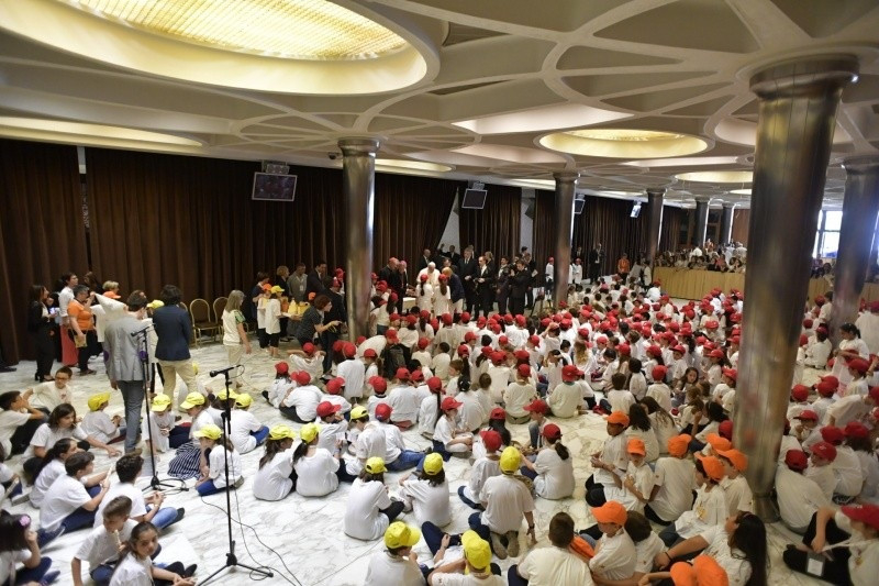 A találkozó végén Ferenc pápa megköszönte a gyerekeknek, hogy nem boltban vásárolható ajándékot hoztak neki, hanem saját magukat, énekeikkel együtt. Azt kérte tőlük, hogy okosan, a szívüket beleadva és hozzá két kezükkel tegyék a mindennapi feladataikat. Emlékezzenek egykori tanáraikra, hiszen ezek a gyökerek, és gyökerek nélkül nem lehet élni, nem lehet virágot hozni. Megtanította nekik a gyökértelen, „sradicato” szó értelmét, ezt többször együtt elismételték, majd a pápa elmagyarázta a szó értelmét. Megköszönte nekik, hogy rendszeresen eljönnek hozzá, ez már a negyedik alkalom, amikor találkozik velük.