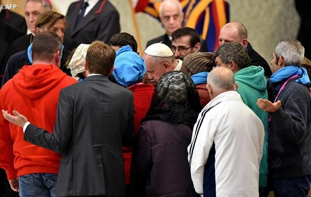 Köszönöm, hogy eljöttetek meglátogatni engem! Köszönöm tanúságtételeiteket! És bocsánatot kérek tőletek, ha valaha is megbántottalak volna titeket szavaimmal, vagy ha nem mondtam ki olyan dolgokat, amelyeket ki kellett volna mondanom! Bocsánatot kérek tőletek a keresztények nevében, akik nem olvassák az evangéliumot és nem találják annak középpontjában a szegénységet! Bocsánatot kérek tőletek, valahányszor mi, keresztények elfordítjuk tekintetünket, amikor szegény emberrel vagy szegénységgel találkozunk! Bocsássatok meg! A ti megbocsátásotok az egyházi embereknek, férfiaknak és nőknek, akik nem akarnak rátok nézni vagy nem akartak rátok nézni, szenteltvíz számunkra; megtisztulás számunkra, segítség számunkra, hogy újból higgyük: a szegénység nagy üzenetként az evangélium szívében van, és nekünk – katolikusoknak, keresztényeknek, mindenkinek – szegényeket szolgáló szegény egyházat kell alkotnunk. Minden férfinak és nőnek – bármelyik valláshoz tartozzon is – minden szegényben Isten üzenetét kell látnia, aki közel jön hozzánk és szegénnyé válik, hogy elkísérjen minket életünkben.