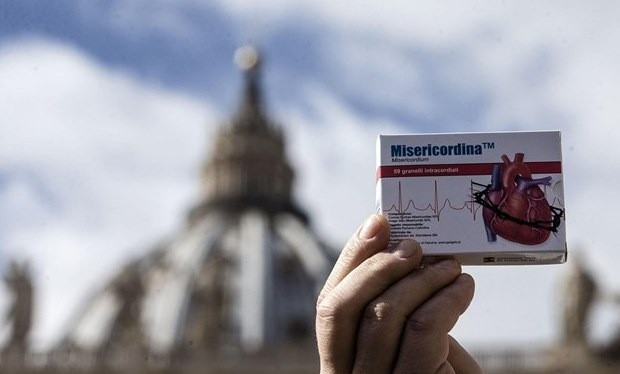 A nagyböjt alkalmas időszak arra, hogy végigjárjuk a megtérés útját, melynek középpontjában az irgalmasság áll. Ezért úgy gondoltam, hogy ma nektek, akik a téren vagytok, ajándékozok egy Misericordinának nevezett „lelki orvosságot”. Egyszer már volt ilyen ajándékozás, most azonban jobb a minőség: Misericordina plus. Ebben a dobozkában rózsafüzér van, és egy kép az irgalmas Jézusról. Most ki fogják osztani nektek az önkéntesek, akik között szegények, hajléktalanok, menekültek és szerzetesek is vannak. Fogadjátok ezt az ajándékot lelki segítségként arra, hogy a szeretetet, a megbocsátást és a testvériséget terjesszétek, főként az irgalmasság évében.