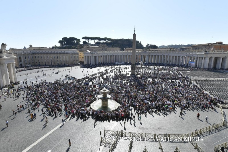 Köszöntelek mindnyájatokat, rómaiak, Olaszországból és a világ számos tájáról érkezett zarándokok! Külön is köszöntöm a veronai Stimmatini Képzési Központ diákjait és tanárait, valamint a különböző országokból érkezett jezsuitákat, akik a római Bellarmin Szent Róbert Kollégium vendégei. Számos lengyel is van itt: sok lengyel zászlót. Üdvözöllek mindnyájatokat, és külön a Szeplőtelen Szűzanya-templomhoz tartozó fiatalokat.