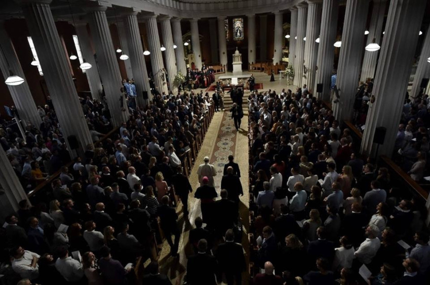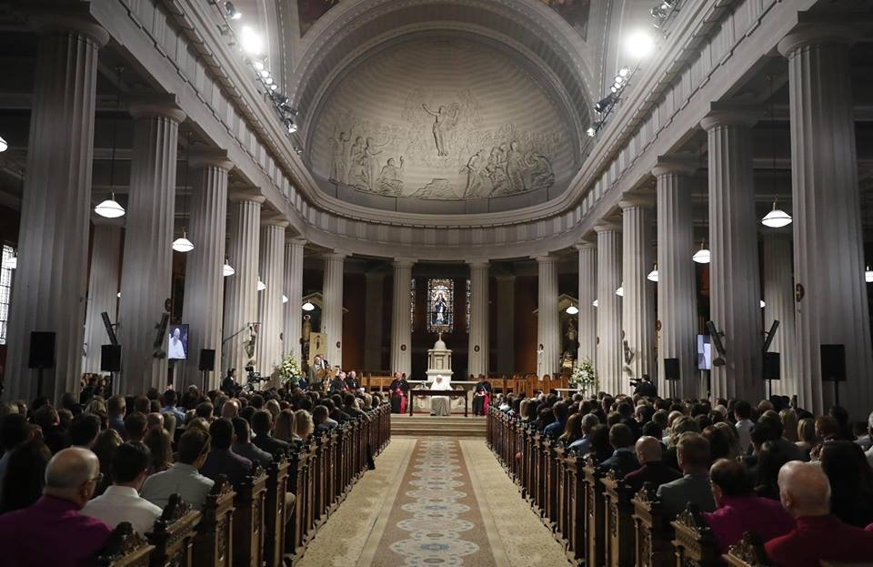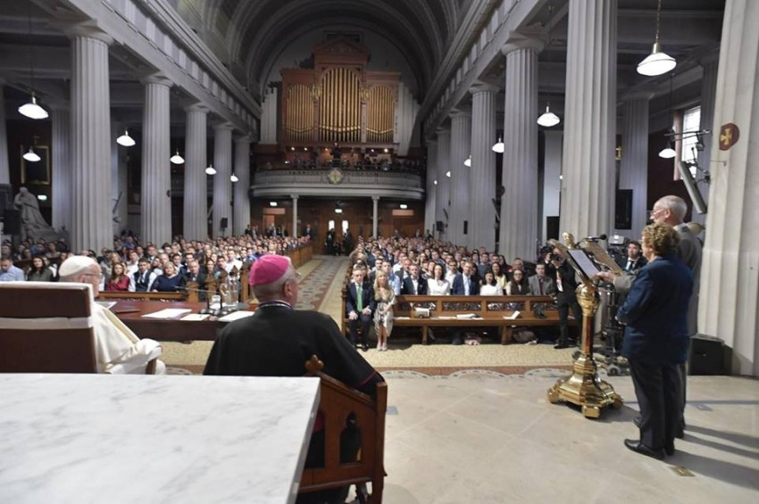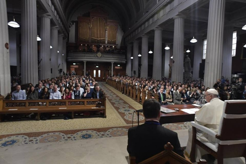 Dublin legjelentősebb katolikus templomában találkozott Ferenc pápa délután, helyi idős szerint fél négykor a katolikus családokkal. A Szűz Mária-székesegyház Dublin katolikus megújulásának szimbóluma. 1825-ben szentelték fel a neoklasszicista stílusú templomot, melyet az anglikán egyházszakadás alkalmával 1534-ben lerombolt egykori ciszterci apátság helyén emeltek. Jelenleg plébániatemplom funkciót is ellát.
