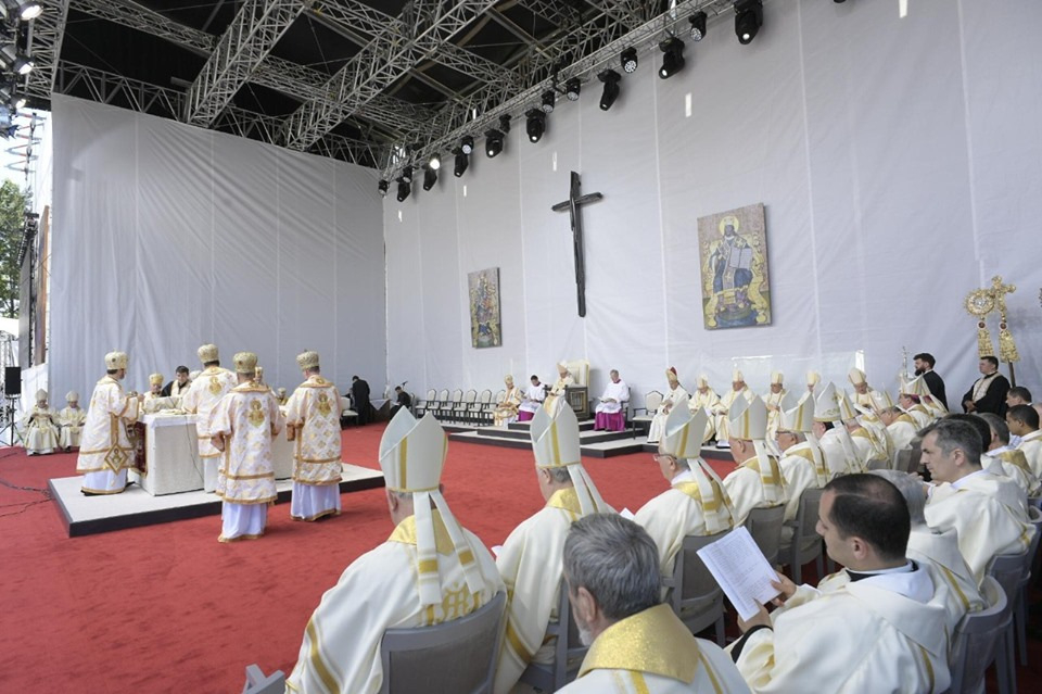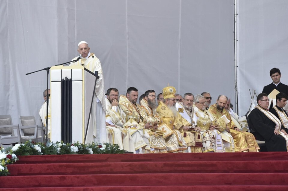 Ez a föld jól ismeri, mennyit szenvednek az emberek, amikor az ideológiának vagy egy rezsimnek a súlya erősebb az életnél, és önmagát normaként állítja az élet és az emberek hite elé; amikor a döntési képesség, a szabadság és a kreativitás tere leszűkül, sőt meg is szűnik (vö. Laudato si’ enciklika, 108). Fivéreim és nővéreim, ti elszenvedtétek azokat a kompromittáláson alapuló beszédeket és tetteket, amelyek odáig mentek, hogy kizárják és megsemmisítik azt, aki nem tudja megvédeni magát, és elhallgattatják a nem tetsző hangokat. Itt főleg arra a hét görögkatolikus püspökre gondolunk, akiket boldoggá avathattam. A rezsim kegyetlen elnyomásával szemben ők példás hitről és népük iránti szeretetről tettek tanúságot. Nagy bátorsággal és lelki erővel fogadták a kemény fogva tartást és a sokféle bántalmazást, és nem tagadták meg szeretett Egyházukhoz tartozásukat. Ezek a pásztorok, a hit vértanúi drága örökséget szereztek és hagytak a román népre, amelyet két szóban foglalhatunk össze: szabadság és irgalom.