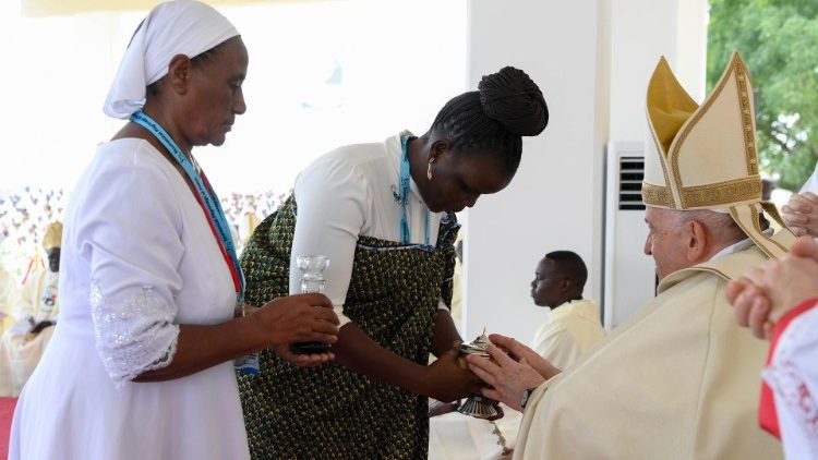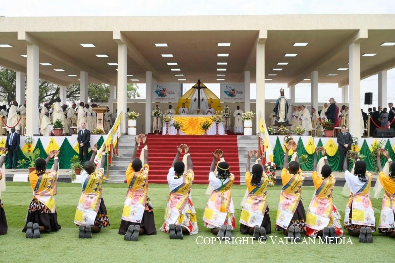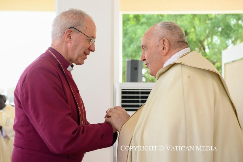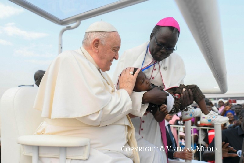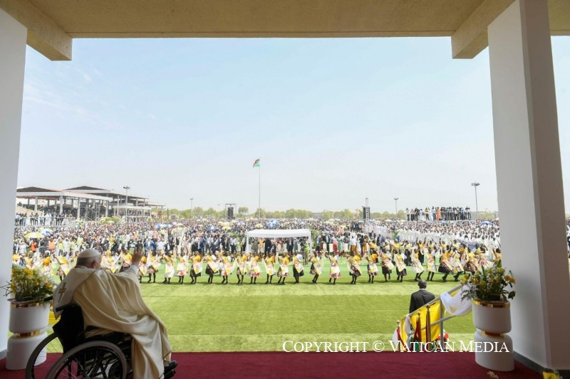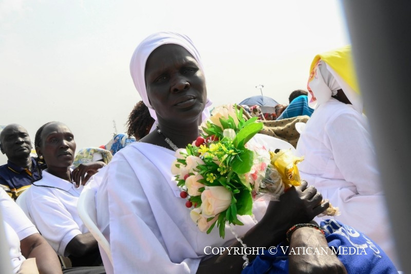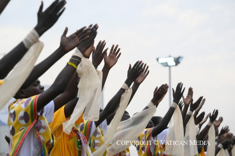 Szeretteim, kívánom, hogy legyetek só, mely nagylelkűen szétterül és elolvad, hogy az evangélium testvéri ízével ízesítse meg Dél-Szudánt; legyetek világító keresztény közösségek, amelyek, mint magasan épült városok, mindenkire jó fényt vetnek, és megmutatják, hogy jó és lehetséges megélni az ingyenességet, táplálni a reményt, mindnyájan együtt építeni a kiengesztelődött jövőt. Testvéreim és nővéreim, veletek vagyok, és kívánom, hogy tapasztaljátok meg az evangélium örömét, azt az ízt és világosságot, amelyet az Úr, „a békesség Istene” (Fil 4,9), „minden vigasztalás Istene” (2Kor 1,3), mindnyájatoknak meg kíván adni.