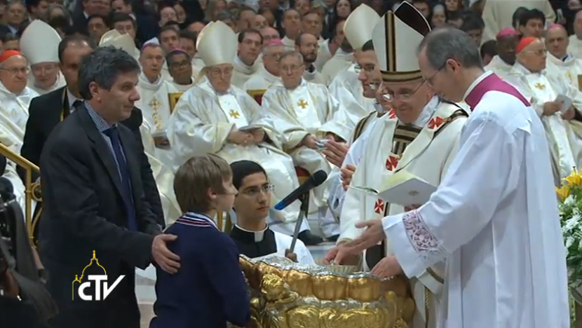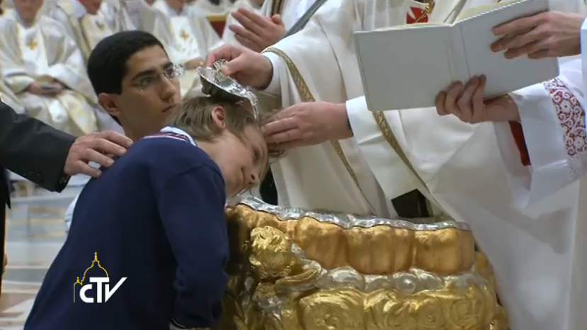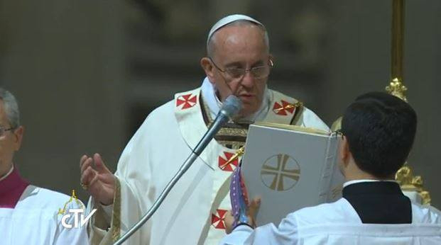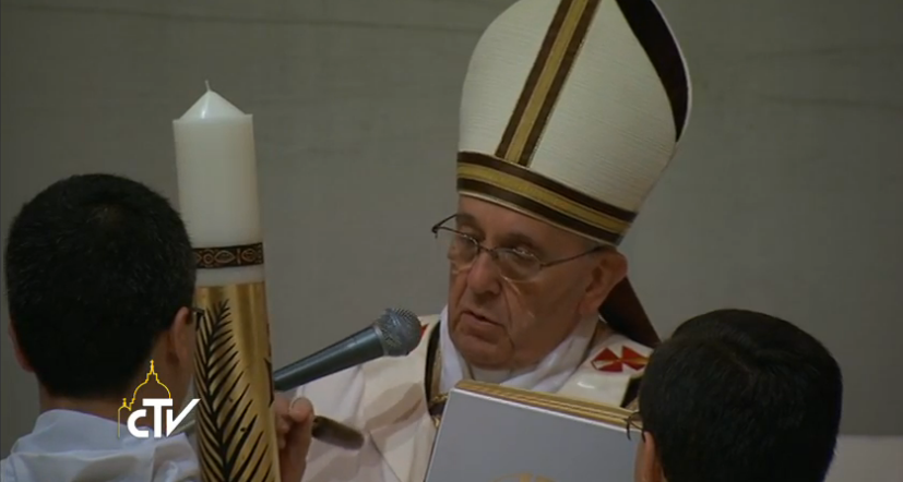 Amikor a tűzről meggyújtotta a húsvéti gyertyát, a kereszt vonalait és a folyó év számait követve, ezeket a szavakat mondta: „Jézus Krisztus tegnap és ma, Ő a kezdet és a vég, Ő az Alfa és az Ómega. Övé az idő és övé az örökkévalóság. Övé a dicsőség és a hatalom mindörökkön-örökké. Ámen.” Ezután még öt tömjénszemet szúrt a feltámadt Krisztust jelképező húsvéti gyertyába ezekkel a szavakkal: „Szent és dicsőséges sebei által őrizzen és védjen meg minket az Úr Krisztus. Ámen.”