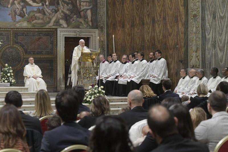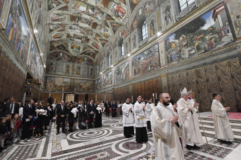 Nem akarok más fontos dolgot mondani nektek. Csak egy figyelmeztetést szeretnék megfogalmazni. A gyermekek nem szoktak a Sixtus-kápolnába jönni, ez az első alkalom, hogy itt vannak. Nincsenek hozzászokva ahhoz, hogy bezárva legyenek, egy kissé meleg helyiségbe zárva legyenek. Nincsenek hozzászokva ahhoz sem, hogy így legyenek felöltözve, egy ilyen gyönyörű ünnepre, mint a mai. Kényelmetlenül érezhetik magukat. Elkezdhet sírni az egyik… – a síráskoncert még nem kezdődött el –, de majd rákezdhet az egyik, aztán majd folytatja a másik… Ne ijedjetek meg, hadd sírjanak és hadd kiabáljanak csak! Inkább, ha sír és panaszkodik a kicsid, talán azért, mert túl melege van: vegyél le róla valamit; vagy azért, mert éhes: szoptasd meg, itt, igen, nyugodtan! Egy dolog, amit tavaly is mondtam: a gyermekek hajlamosak „kórust” alkotni: elég, ha az egyik megadja a „lá”-t, s már rá is kezdenek mindnyájan, és koncertet adnak. Ne ijedjetek meg tehát! Gyönyörű prédikáció, amikor egy gyermek sír a templomban, gyönyörű prédikáció! Tegyetek meg mindent, hogy jól érezze magát, és menjünk tovább!