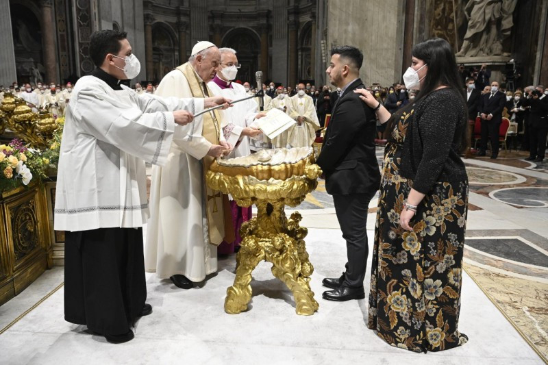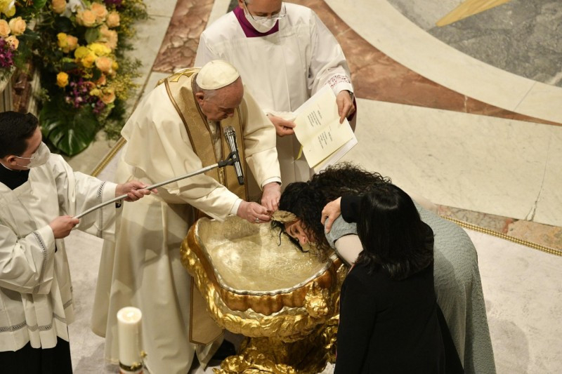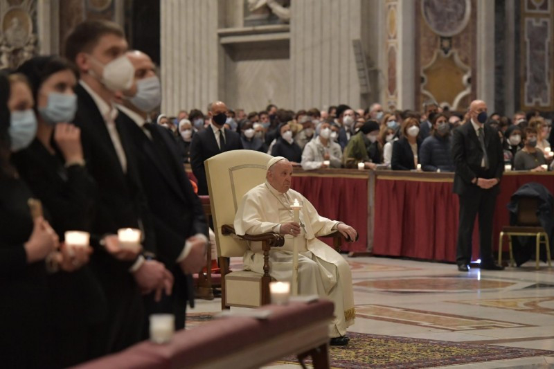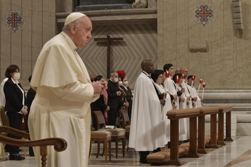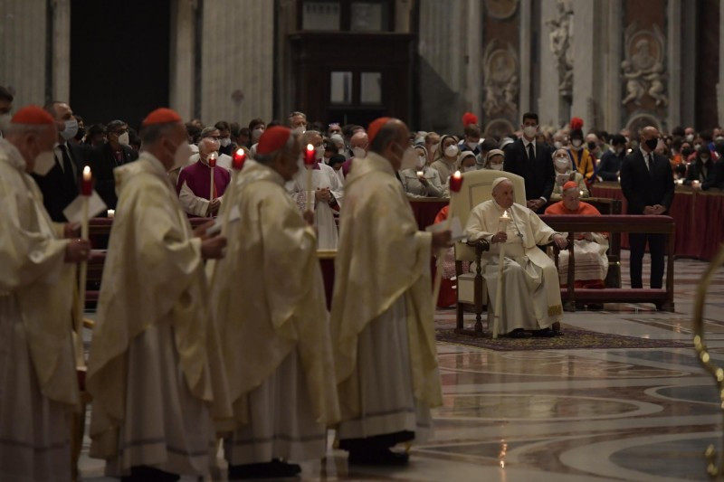 Sok író megidézte már a csillagos éjszakák szépségét. A háború éjszakáit viszont halálos fénycsíkok barázdálják. Ezen az éjszakán, testvéreim és nővéreim, engedjük, hogy az evangéliumi asszonyok kézen fogjanak bennünket, hogy velük együtt felfedezzük Isten fényének felkeltét, mely beragyogja a világ sötétségét. Ezek az asszonyok, amikor az éjszaka már lassan véget ért, és a hajnal első fényei észrevétlenül kezdtek derengeni, a sírhoz mentek, hogy bekenjék Jézus testét. És ott megrázó élményben volt részük: először is felfedezik, hogy a sír üres; aztán két, tündöklő ruhába öltözött alakot látnak, akik közlik velük, hogy Jézus feltámadt; ők pedig azonnal szaladnak, hogy hírt adjanak róla a többi tanítványnak (vö. Lk 24,1–10). Látnak, hallanak, hírt adnak: mi is ezzel a három cselekedettel lépjünk be az Úr húsvétjába.