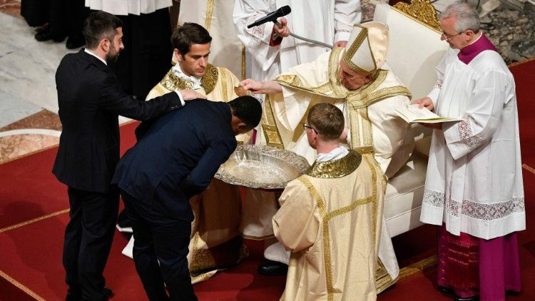 Az oltárhoz vezető körmenetet, a húsvéti gyertya meggyújtását és az Exsultet eléneklését az igeliturgia és a keresztelés liturgiája követte, melynek során a pápa nyolc újonnan megtért – Albániából, az Amerikai Egyesült Államokból, Nigériából, Olaszországból és Venezuelából származó – hívőnek szolgáltatta ki a beavató szentségeket.
