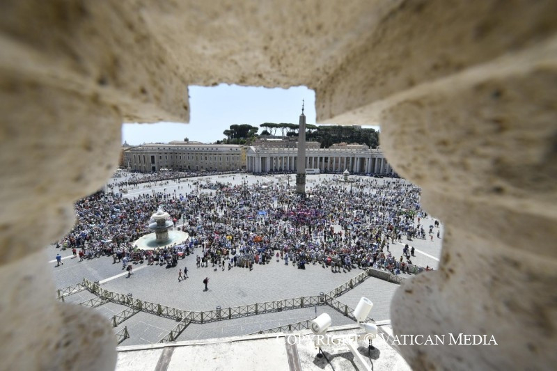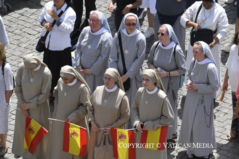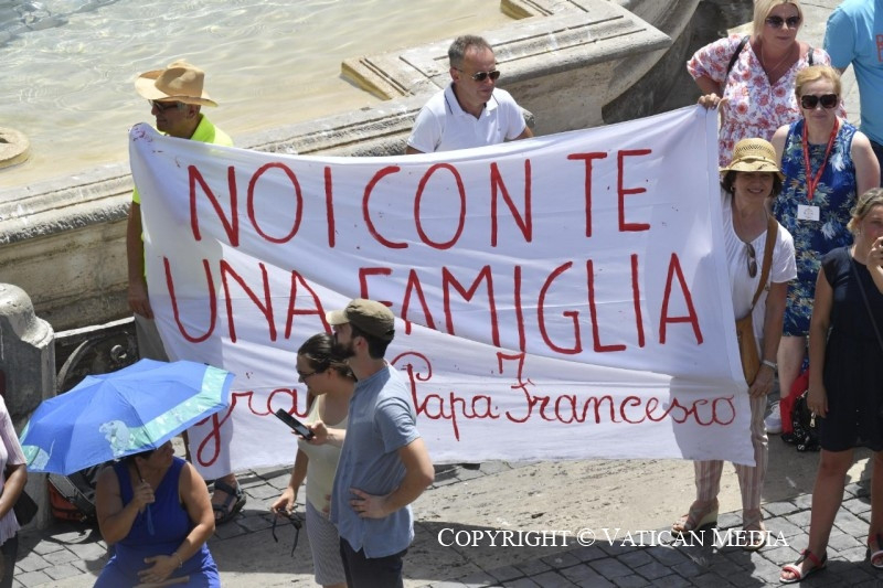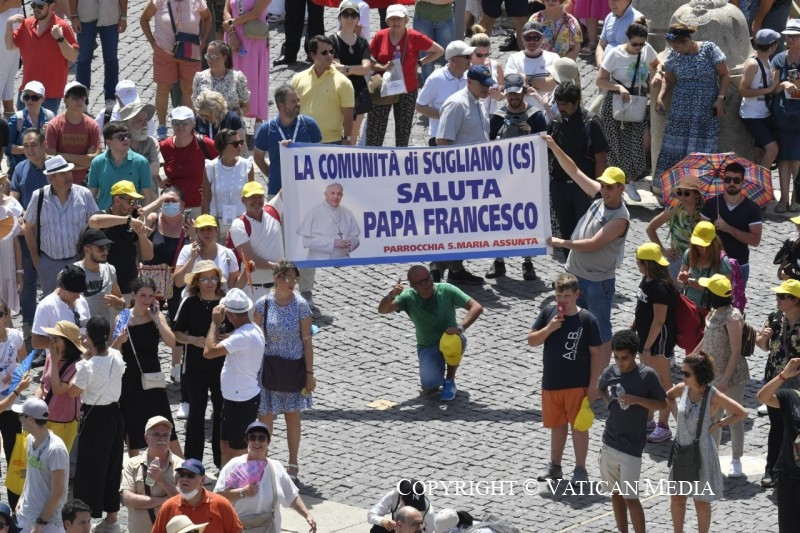 Köszöntelek mindnyájatokat, rómaiak, Olaszországból és sok más országból érkezett zarándokok. Argentin zászlót is látok, a honfitársaim, nagy szeretettel köszöntelek benneteket! Külön is köszöntöm a lisszaboni híveket, a franciaországi Neuillyben lévő Institut Notre-Dame de Sainte-Croix diákjait és az ausztriai Telfsből érkezett diákokat. Köszöntöm a riesi vegyes kórust, a rovigói szülők csoportját és a maggianicói Beato Serafino Morazzone pasztorális közösséget. Látom, hogy vannak ukrán zászlók is. Ukrajnában folytatódnak a bombázások, melyek halált, pusztulást és szenvedést okoznak a lakosságnak. Kérem, ne feledkezzünk meg erről a háború sújtotta népről! Ne feledkezzünk meg róluk szívünkben és imáinkban!