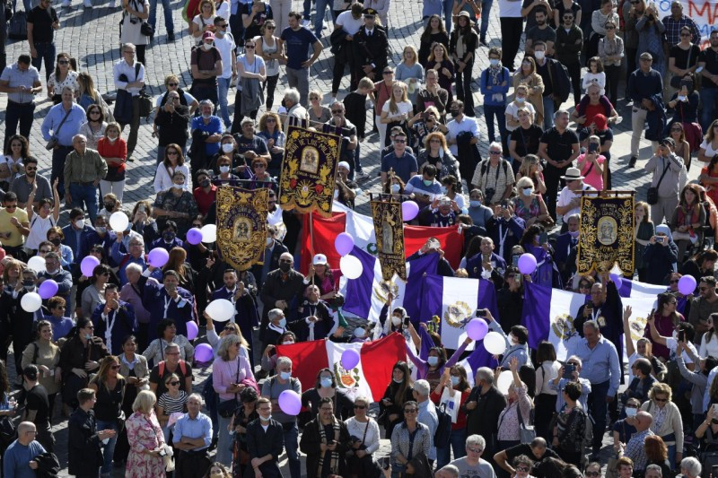 Köszöntelek mindannyiatokat, kedves rómaiak és különböző országokból érkezett zarándokok. Külön is köszöntöm a perui közösséget – rengeteg itt a perui zászló! –, mely a Señor de los Milagros [a csodák Ura] ünnepét tartja. Az idei betlehem szintén a perui közösségből érkezik. Üdvözlöm továbbá a Rómában élő Fülöp-szigetekiek közösségét; üdvözlöm a spanyolországi Centro Academico Romano Fundaciónt; Jézus Szent Szívének Leányait, akik káptalanra gyűltek egybe, és az Emmanuel Közösség csoportját. Üdvözlöm továbbá a Trevisóból Rómába tartó „maraton” résztvevőit, valamint azokat, akik a „Camminón” vesznek részt Sacra di San Micheléből Monte Sant’Angelóig; és üdvözlöm a Szent Luigi Guanella emlékére szervezett kerékpáros zarándoklat résztvevőit, a palmi, asolai és San Cataldó-i hívőket. Külön is üdvözlöm az olasz katolikusok szociális hetének résztvevőit, akik Tarantóban gyűltek össze, és a „A bolygó, amelyet remélünk” témáról tárgyalnak.