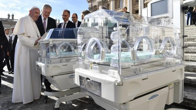 A General Electric HealthCare cég által forgalmazott inkubátorokat a Bayer nemzetközi vállalat ajándékozta a pápának a november 21-i szerdai általános kihallgatáson.