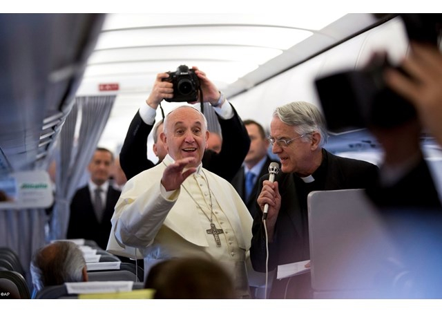 A sajtótájékoztatót Federico Lombardi szentszéki szóvivő nyitotta meg ezekkel a szavakkal: „Nagyon hálásak vagyunk a Szentatyának, hogy ismét itt van velünk. Jóllehet ez egy nagyon sűrű nap volt. Néhány, valóban csak pár kérdés erejéig rendelkezésünkre áll az út alatt. Elfogadtuk, hogy elsőként három albán kollégánk tegye föl kérdéseit, akik idefelé is velünk tartottak: eljöttek Rómába, hogy Önnel utazhassanak, most pedig ismét visszatérnek Rómába, hogy Önnel együtt fejezzék be ezt az utat. A három albán televízió munkatársai. Mira Tuci asszonynak adom a szót, az albán nemzeti televíziótól.”