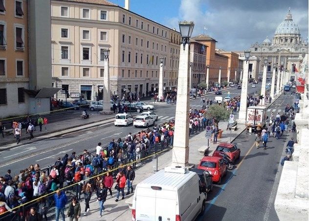 Április 23-án, Ferenc pápa névnapján 13-16 éves fiúk és lányok ezrei lepték el a várost. Színes ruhában, vállukon kicsi hátizsákkal, arcukon széles mosollyal és alapos visongással adnak az Örök Városnak igazi tavaszi üdeséget. Ez az ő napjuk, a kamaszok jubileumi napja. A mai nap a nekiindulásé. Mindenki áthalad a Szent Péter-bazilika szentkapuján, ehhez pedig az utat a Tiberisz partjától kezdik, a Via della Conciliazione elején. Csoportokba szerveződnek és az irgalmasság keresztjét magasba emelve imádkozva, de inkább énekelve vonulnak a Szent Péter térre.