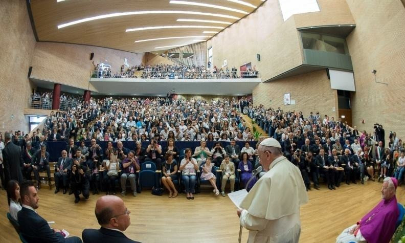 Ferenc pápa, miután megköszönte a fogadtatást, így szólt: „A rektor úr megismételte szavaimat, amelyeket egyszer mondtam: Istenünk a meglepetések Istene. Ez így igaz. Minden nap meglep bennünket valamivel. De a rektor úr azt is mondta: Isten széttöri a sablonokat. Ha nekünk nincs elég bátorságunk ahhoz, hogy megtörjük a sablonokat, akkor soha nem haladhatunk előre, mert Istenünk arra késztet, hogy legyünk kreatívak a jövőt illetően. Ez egy szép teológiai megfogalmazás.”
