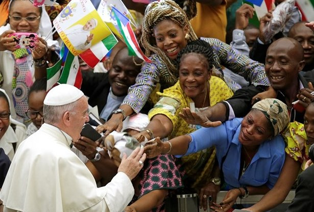 Azt mondtam, hogy az irgalmasság olyan út, amely a szívtől a kézig vezet. A szívünkben befogadjuk Jézus irgalmát, aki minden bűnünket megbocsátja, Isten ugyanis mindent megbocsát, felemel minket, új életet ad nekünk, és megfertőz minket az ő együttérzésével. Abból a bocsánatot kapott szívből és Jézus együttérzésével indul el az út a kéz, vagyis az irgalmasság cselekedetei felé. Tegnapelőtt mesélte nekem egy püspök, hogy székesegyházában – és más templomokban is – bejárati és kijárati irgalmasságkaput egyaránt nyitott. Kérdeztem tőle: „Mi volt ezzel a szándékod?” „Egyik kapu a belépésre szolgál, a bocsánatkérésre és Jézus irgalmának befogadására, a másik pedig az irgalmasság kifelé vezető kapuja, hogy elvigyük az irgalmat másoknak, az irgalmasság cselekedeteivel.” Milyen okos ez a püspök! Mi ugyanezt tesszük a szívtől a kézig vezető úttal: az irgalmasság kapuján lépünk az egyházba, hogy befogadjuk Jézus bocsánatát, aki azt mondja nekünk: „Állj fel! Járj, menj!” És ezzel a „menj”-jel – talpon – kimegyünk a kijáraton. Ez a kifelé tartó egyház: az irgalmasság útja, amely a szívtől a kézig ér. Ezt az utat járjátok újra meg újra!