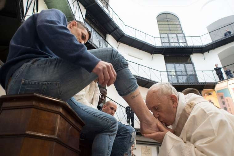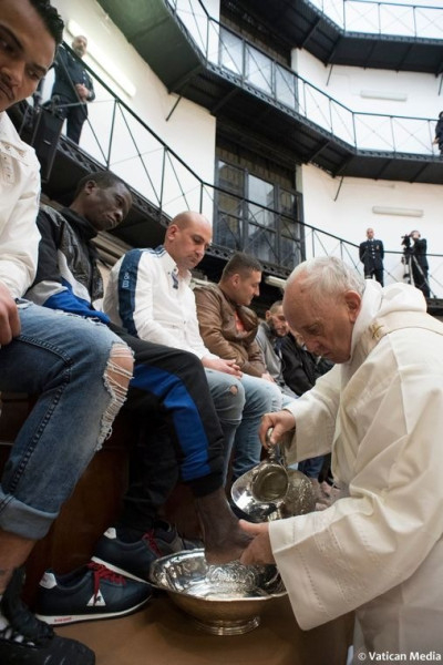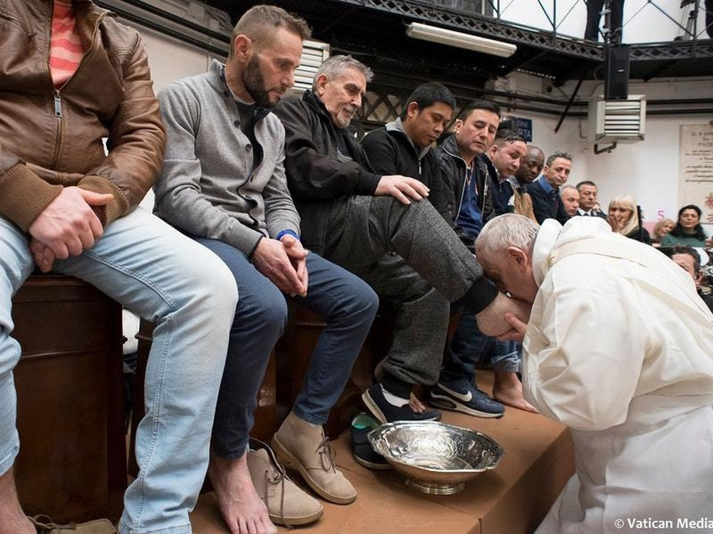 A pápa a tizenkét apostolra emlékezve, 4 olasz, 2 fülöp-szigeteki, 2 marokkói, 1 moldovai, 1 kolumbiai, 1 nigériai és 1 Sierra Leone-i rabnak mosta meg a lábát; nyolcan katolikusok; ketten muszlimok; egy ortodox, egy pedig buddhista.