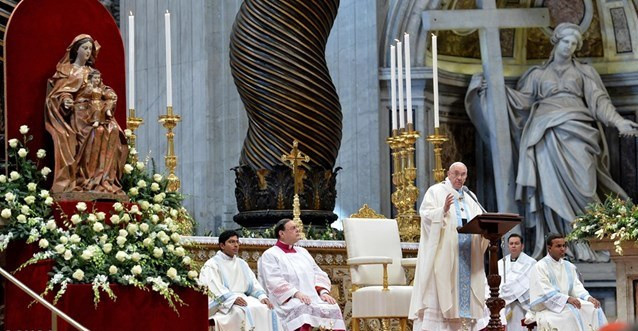 Mindannyiótokat arra hívlak, botok nélkül, hogy álljatok fel, és háromszor állva köszöntsük Máriát a korai egyház szavaival: „Isten Szent Anyja! Isten Szent Anyja! Isten Szent Anyja!” – zárta homíliáját Ferenc pápa.