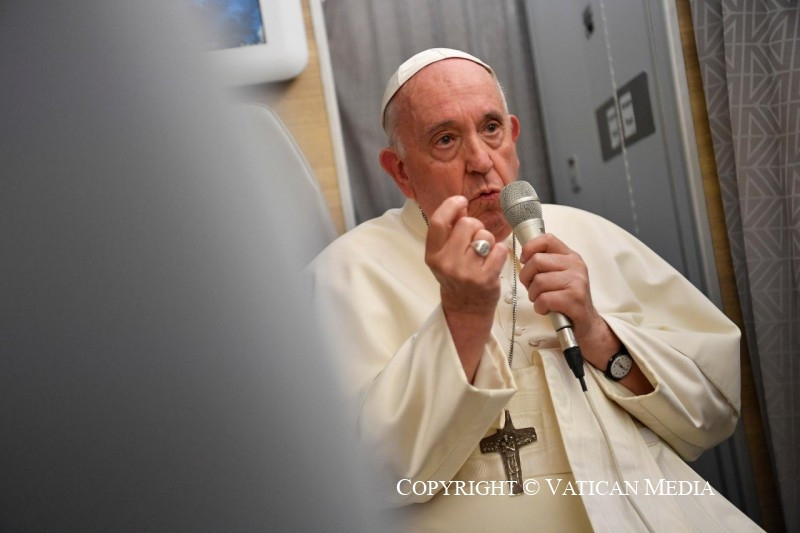 – Jó estét mindenkinek! Szentatya, ezek a napok a zarándoklat és a bűnbánat napjai voltak, különböző szakaszokban, sok találkozással, gesztussal – a legutóbbi megható gesztus Iqaluitban. Ezek a napok – ezt Ön mondta – nem érnek véget azzal, hogy elhagyjuk ezt a földet, és ebben az értelemben is érkezünk most el ehhez a találkozóhoz az újságírókkal. De talán szeretne néhány szót szólni hozzánk, mielőtt elkezdenénk…