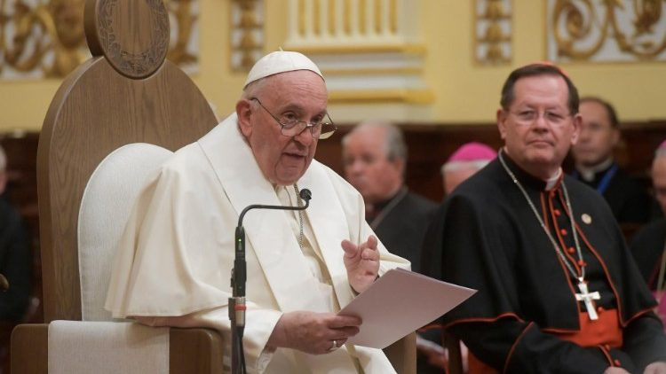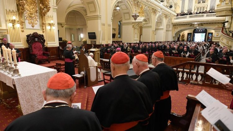 Jelzésértékű, hogy a québeci Notre-Dame bazilikában találkozunk, ennek a részegyháznak a székesegyházában, Kanada prímási székénél, amelynek első püspöke, Szent François de Laval 1663-ban nyitotta meg a szemináriumot, és egész szolgálata alatt a papképzésnek szentelte magát. Az esti dicséret imént hallott rövid olvasmánya az „idősebbekről”, a „presbiterekről”, vagyis a papokról szól. Szent Péter így buzdított bennünket: „Legeltessétek Isten rátok bízott nyáját, viseljétek gondját, ne kényszerből, hanem önként” (1Pét 5,2). Amikor most Isten népeként itt összegyűlünk, emlékezzünk arra, hogy életünk pásztora Jézus, aki gondunkat viseli, mert igazán szeret bennünket. Nekünk, az Egyház pásztorainak ugyanilyen nagylelkűen kell „legeltetnünk” a nyájat, hogy Jézus mindenkiről való gondoskodása és mindenki sebeivel való együttérzése kinyilvánulhasson.