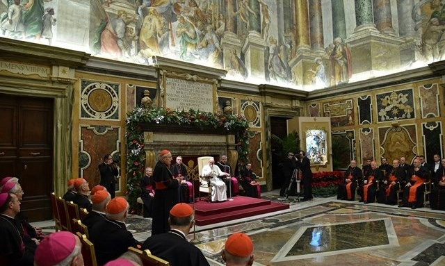 Beszéde elején Ferenc pápa bocsánatot kért, hogy szokásától eltérően nem állva beszél, mert napok óta tartó influenzás megbetegedése miatt nem érzi magát elég erősnek. Felidézte a korábbi hasonló alkalmakat, így amikor két éve Szent József példája nyomán a szakmaiságról és a szolgálatról beszélt, tavaly pedig a „kuriális betegségek katalógusát” nyújtotta át azzal a szándékkal, hogy e kísértésekkel szemben felkészítsen a kiengesztelődés szentségére. „Ma a tavalyi betegségekkel szemben »a kuriális antibiotikumokról« szeretnék szólni” – tette hozzá szabadon, majd így folytatta: „Ezen betegségek némelyike előfordult az elmúlt év során, nem kevés fájdalmat okozott az egész testnek, és sok ember lelkét megsebezte, a botránnyal is! Szükséges megemlíteni, hogy ami volt a múltban és ami lesz a jövőben, az őszinte megfontolás és eltökélt előkészület tárgya. A reformot határozottan, világosan és eltökélten folytatjuk, mert ecclesia semper reformanda est, az egyházat mindig meg kell újítani.”