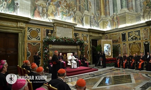 „Mindazonáltal a betegségek és a botrányok nem fedhetik el annak a szolgálatnak a hatékonyságát, amit a Római Kúria fáradsággal, felelősséggel, elkötelezettséggel és odaadással végez a pápa és az egyház számára, és ez nagy vigasz” – hangsúlyozta a Szentatya, majd idézett Szent Ignác lelkigyakorlatos könyvéből: „A rossz szellem sajátossága az, hogy a lelket mardossa, szomorúvá teszi, és hamis okkal nyugtalanítva akadályokat gördít eléje, hogy ne haladhasson előre. A jó szellem sajátossága pedig az, hogy bátorságot, vigaszokat, könnyeket, sugallatokat és nyugalmat ad, mindent megkönnyítve és minden akadályt elgördítve, hogy az ember a jó művelésében egyre előbbre haladjon.” (Lelkigyakorlatok, 315)
