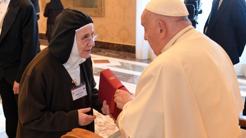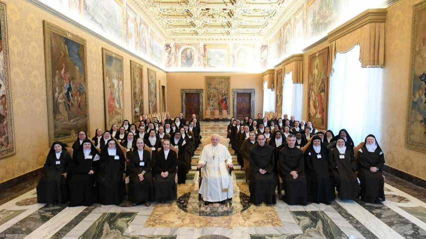 Ez általánosságban a megszentelt élet összes intézményére igaz, de ti, klauzúrában élő nővérek ezt különleges módon megtapasztaljátok, mert teljes mértékben átélitek a világtól való elkülönülés és a világba ágyazódás közötti feszültséget. Ti biztosan nem menekültök az ember belső világára szűkülő lelki vigasztalásba vagy valóságtól elidegenedett imádságba; ellenkezőleg, a ti utatok olyan út, amelyen engednetek kell, hogy Krisztus szeretete megérintsen benneteket, egészen odáig, hogy egyesültök vele, hogy ez a szeretet áthassa egész létezéseteket, és kifejeződjön minden mozdulatotokban és összes mindennapi cselekedetetekben.