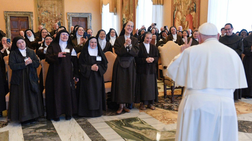 Örülök, hogy találkozhatom veletek, amikor összegyűltetek abból a célból, hogy együtt gondolkodjatok és dolgozzatok konstitúciótok felülvizsgálatán. Hogy a '90-es években vagy a korábban készült konstitúcióról van-e szó, nem tudom; az a lényeg, hogy dolgoztok rajta. Fontos ez a találkozó, mely nem csupán a közösségi élet természetes fejlődésének emberi szükségletére válaszol; ez inkább a „Lélek ideje”, amelyet az ima és a megkülönböztetés alkalmaként kell megélnetek. Belsőleg nyitottnak maradva arra, amit a Szentlélek sugallni akar nektek, az a feladatotok, hogy új beszédmódokat, új utakat és új eszközöket találjatok, melyek nagyobb erővel lendítik előre a szemlélődő életet, melyre az Úr meghívott benneteket, hogy karizmátok megőrződjön – a karizma változatlan –, hogy karizmátok érthető legyen, és sok szívet vonzzon, Isten dicsőségére és az Egyház javára. Ha egy kármel jól működik, akkor vonz, vonz! Nem igaz? Mint a fény a legyeket… Vonz, vonz!