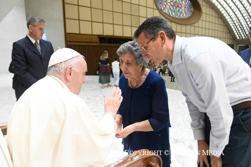 A feltámadt Úr – nem véletlenül –, miközben a tónál várakozik az apostolokra, megsüt néhány halat (vö. Jn 21,9), majd megkínálja őket. A gondoskodó szeretetnek ez a gesztusa bepillantást enged abba, hogy mi vár ránk, amikor átkelünk a túlsó partra. Igen, kedves testvéreim, különösen ti, idősebbek, az élet java még hátravan. „De hát öregek vagyunk, mi várhat még ránk?” A java, mert az élet java még vár ránk. Reménykedünk az életnek ebben a teljességében, amely mindannyiunkra vár, amikor az Úr magához hív bennünket. Az Úr édesanyja és a mi édesanyánk – aki előttünk érkezett a mennybe – adja vissza nekünk a várakozás izgalmát! Mert ez nem egy érzéketlen, unott várakozás, nem, ez egy izgalommal teli várakozás: „Mikor jön el az én Uram? Mikor mehetek oda?” Egy kis félelem is eltölt bennünket, mert nem tudjuk, mit jelent ez az átlépés. Az áthaladás azon az ajtón félelmet ébreszt bennünk, de mindig ott van az Úr, aki fogja a kezünket és kísér bennünket. Ha pedig egyszer átléptünk a küszöbön, kezdődik az ünneplés! Álljunk készen, kedves kortársaim, „bácsik” és „nénik”, álljunk készen, ő vár ránk, csak egy átlépésről van szó, és aztán jöhet az ünneplés!
