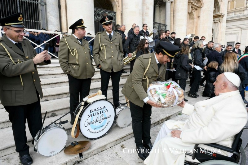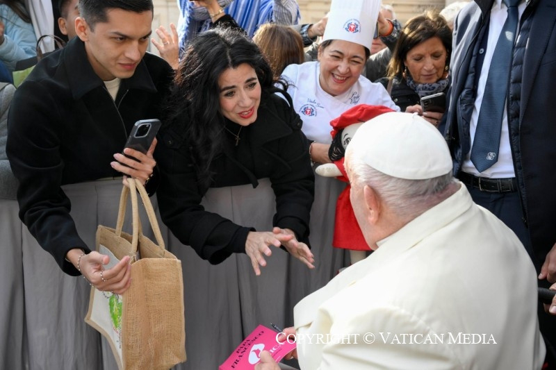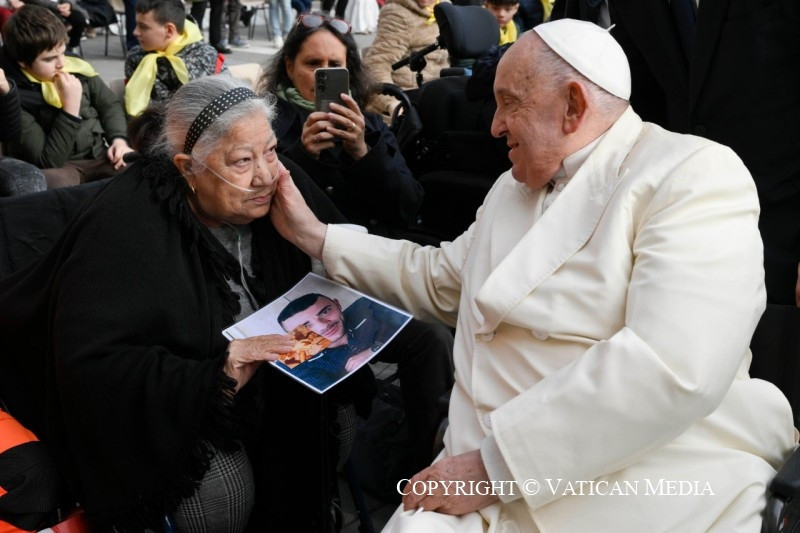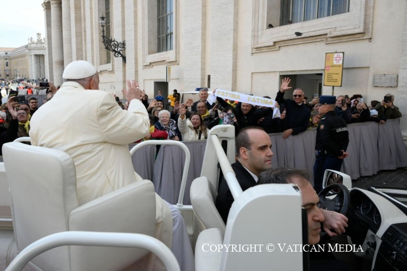 Ahogyan egyetlen képet, ezt a „Szentlélek jegyese” képet sem szabad abszolutizálni, hanem úgy kell fogadni, amennyi igazság van benne, s ez egy nagyon szép igazság. Ő a jegyes, de ezt megelőzően a Szentlélek tanítványa. Jegyes és tanítvány. Tanuljunk Máriától, hogy fogékonyak legyünk a Lélek indításaira, különösen, amikor azt sugallja, hogy „gyorsan keljünk fel”, és menjünk segíteni valakinek, aki rászorul, ahogyan Mária tette, közvetlenül azután, hogy az angyal elhagyta őt (vö. Lk 1,39). Köszönöm!
