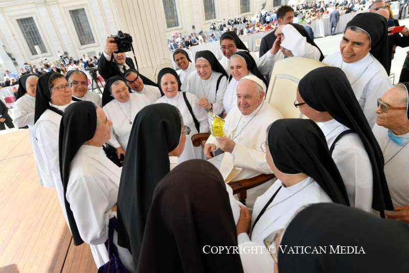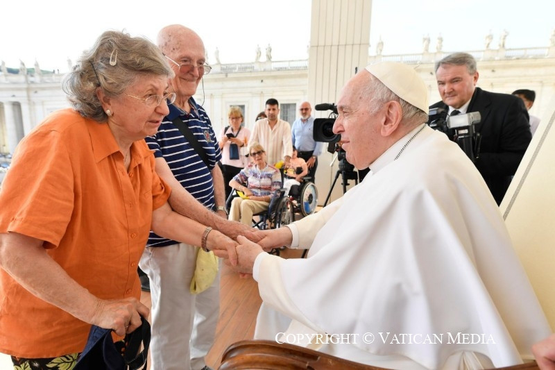 Az öregkorról szóló katekéziseink sorában ma a feltámadt Jézus és Péter párbeszédéről elmélkedünk, melyet János evangéliumának végén olvashatunk (Jn 21,15–23). Ez egy megindító párbeszéd, amelyből Jézusnak a tanítványai iránt érzett minden szeretete átsugárzik, és a velük – különösen Péterrel – való kapcsolatának magasztos embersége is: gyengéd, de nem bárgyú, közvetlen, erős, szabad, nyílt kapcsolat. Emberi, és igazságban zajló kapcsolat. Így János oly spirituális, oly magasröptű evangéliuma egy Jézus és Péter közötti megrendítő kéréssel és szeretetfelajánlással zárul, ami – teljesen természetesen – egy közöttük zajló vitával fonódik össze. Az evangélista megjegyzi, hogy ő a tények igazságáról tesz tanúságot (vö. Jn 21,24), és bennük kell keresni az igazságot.