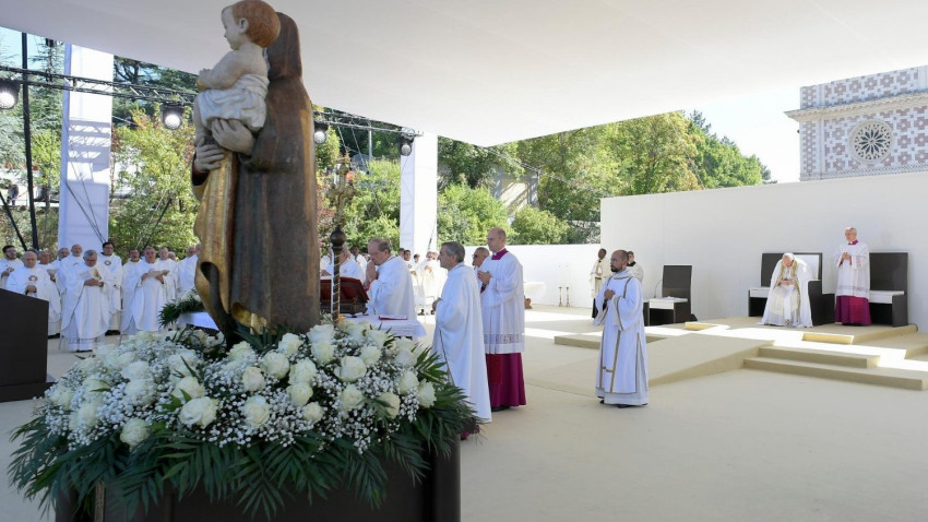 Most pedig hívjuk segítségül a Szűzanyát, hogy – ahogy a homília végén mondtam – szerezzen bocsánatot és békét az egész világnak! Imádkozzunk az ukrán népért és minden népért, amely a háborúk miatt szenved. A béke Istene ébressze fel a nemzetek vezetőinek szívében a könyörület és az irgalmasság emberi és keresztény érzékét! Mária, irgalmasság anyja és béke királynője, imádkozz értünk!