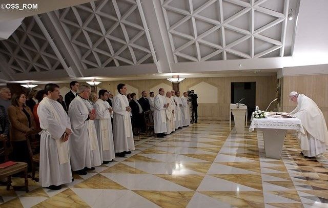 A két szentírási szakasz nyomán a Szentatya a színlelés, a látszat, a külsődleges magatartás veszélyeire intett Jézus szavait idézve: „Ti, farizeusok, tisztán tartjátok ugyan a pohár és a tál külsejét, de belül tele vagytok rablással és gonoszsággal.” Hozzátette, hogy az Úr nagyon gyakran az emberek szemére veti: „A ti bensőtök rossz, nem igaz, és nem szabad. Rabszolgák vagytok, mert nem fogadtátok el az igazságosságot, ami az Istentől ered, az igazságosságot, amit Jézus adott nekünk”.