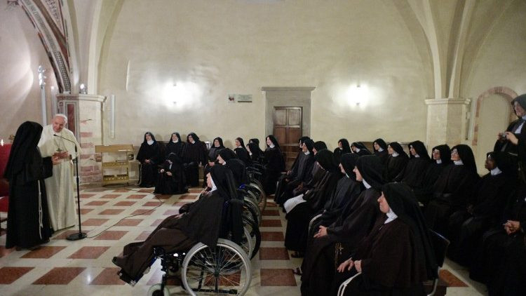 A pápa arra buzdította a klauzúrás nővéreket, hogy maradjanak figyelmesen szemlélődő szerzetesek. A figyelem nem azoké, akik az ablakból nézik, mi történik odakinn napközben, a jól szemlélődő elme nem vesztegeti az idejét csevegésre. Ám ahhoz, hogy figyelmesek legyünk az Úr iránt, békés szívűnek kell lenni, és vissza kell térni a meghívás pillanatához, amit a szív akkor érzett, amikor Jézus követésének örömét tapasztalta meg.