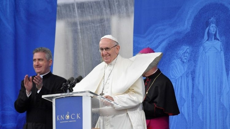 Szeretném külön is köszönteni azokat a férfiakat és nőket, akik börtönben vannak ebben az országban, és köszönetet mondani azoknak, akik közülük írtak nekem, miután megtudták, hogy Írországba jövök. Szeretném elmondani nektek, hogy közel, nagyon közel vagyok hozzátok! Biztosítalak benneteket és családtagjaitokat közelségemről és imámról. Mária, az irgalmasság anyja virrasszon felettetek, és erősítsen meg benneteket a hitben és a reményben!